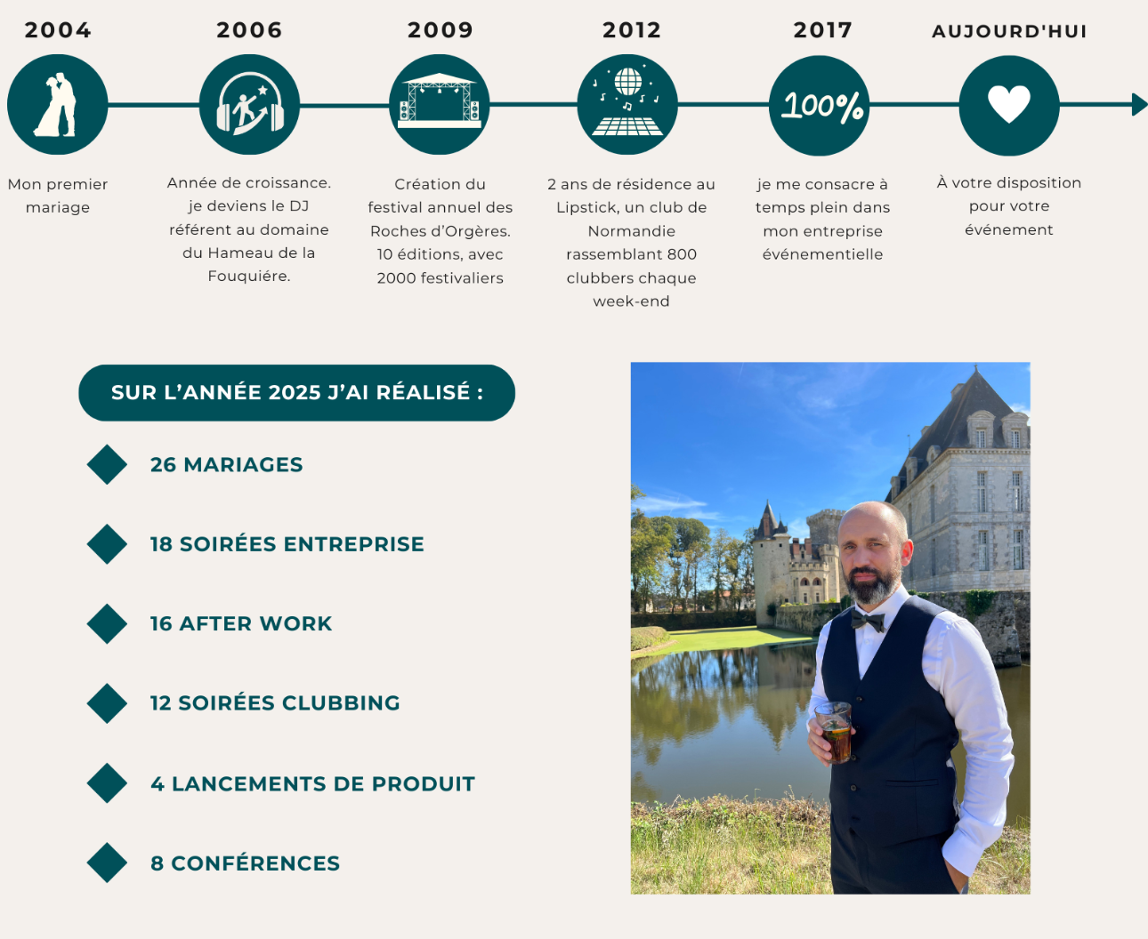 Fondateur d’un festival ayant rassemblé plus de 2000 personnes, ex-DJ résident en club, et toujours à l’écoute de mes clients, je mets un point d’honneur à offrir des prestations DJ sur-mesure, élégantes et vibrantes.